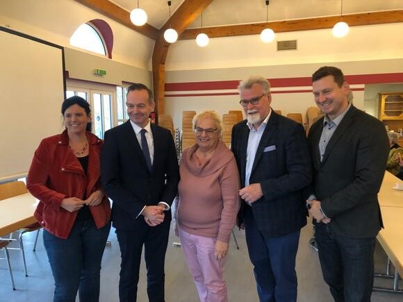 v. l. n. r.: Carina Konrad, VLK-Vorsitzende und Bundestagsabgeordnete, Volker Wissing, Bundesminister für Verkehr und Digitales, Marlene Hölz, Ortsbürgermeisterin von Dorsheim, Herbert Mertin, Minister der Justiz von Rheinland-Pfalz, Mario Brandenburg, Parlamentarischer Staatssekretär im Bundesministerium für Bildung und Forschung
