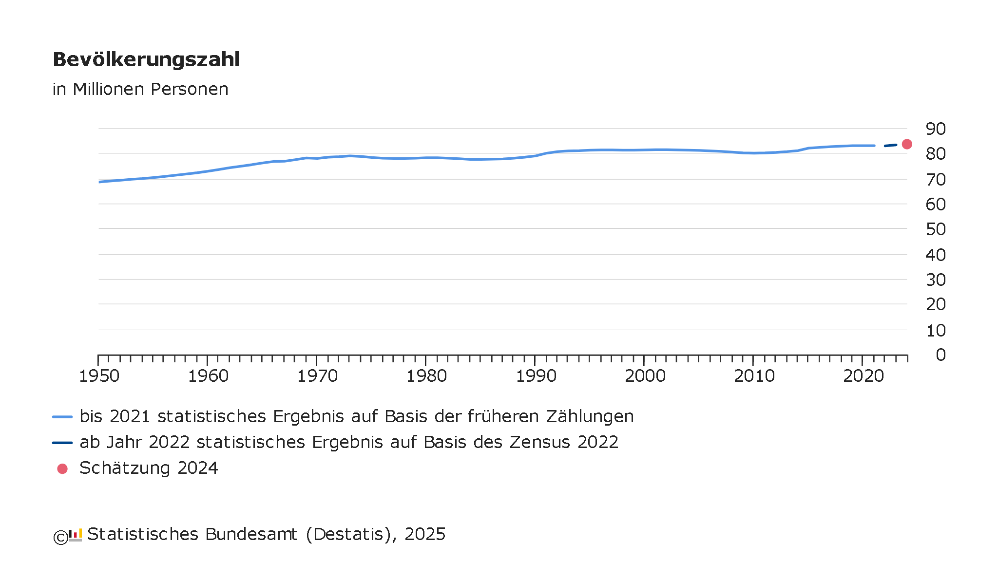 Bevölkerung im Jahr 2024 um 100 000 Menschen gewachsen, Fast 83,6 Millionen Menschen lebten zum Jahresende 2024 in Deutschland Nettozuwanderung gegenüber 2023 um mehr als ein Drittel zurückgegangen Zahl der Sterbefälle übersteigt Zahl der Geburten deutlich: Geburtendefizit im dritten Jahr in Folge größer als 300 000 Personen Zum Jahresende 2024 lebten fast 83,6 Millionen Menschen in Deutschland.