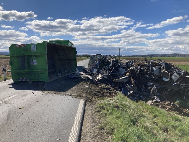 Brummi-Anhänger kippt um und verliert Schrott, Freigericht, Somborn, Ein Brummi samt Anhänger war am Montagvormittag auf der Landesstraße 3202 in Fahrtrichtung Bernbach unterwegs, als der Fahrer des Sattelzuges ersten Erkenntnissen zufolge gegen 11.45 Uhr nach rechts auf den Grünstreifen abkam. Bei dem Versuch den Laster und den Anhänger wieder unter Kontrolle zu bringen, kippte der Anhänger, welcher vollbeladen war mit Altmetall, auf die Seite.