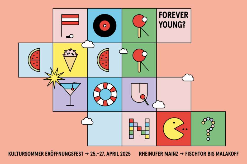 2025 steht die Kultur unter dem Motto "Forever Young?" Das große Kulturfest zur Eröffnung findet vom 25. bis zum 27. April 2025 am Rheinufer - vom Fischtorplatz bis zum Fort Malakoff - in Mainz statt! Musik, Theater, Tanz, Lichtkunst, ein Weltrekord und viele weitere Überraschungen erwarten die Besucher:innen der Kultursommer-Eröffnung vom 25. bis zum 27. April in Mainz.