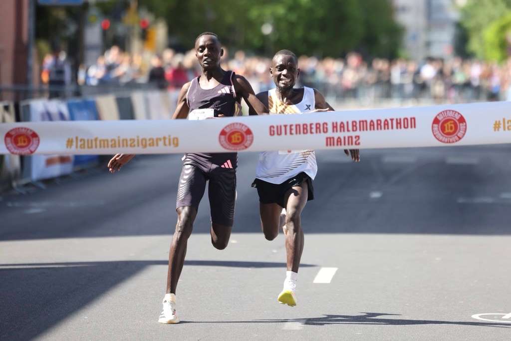 ...beim Gutenberg Halbmarathon Mainz Spektakuläres Finish: Zwei Athleten zeitgleich in starken 61:01 Minuten im Ziel / Frauen-Siegerin läuft unter 70 Minuten / „Eindrucksvoll bewiesen, dass man in Mainz einen schnellen Halbmarathon laufen kann“ / 10.888 Teilnehmer insgesamt Neue Streckenrekorde, hochklassige Siegerzeiten, prächtige Stimmung am Streckenrand:
