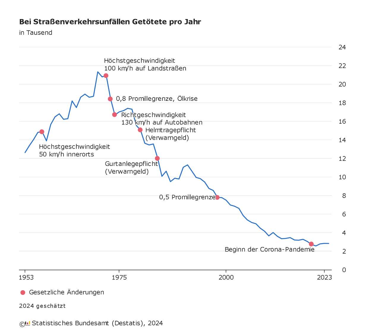 Zahl der Verkehrstoten 2024 gegenüber dem Vorjahr voraussichtlich nahezu unverändert Zahl der im Straßenverkehr Verletzten unverändert bei rund 370 000. Auch Zahl der Unfälle mit Personenschaden sowie mit Sachschaden stagniert. Die Zahl der Verkehrstoten auf deutschen Straßen wird im Jahr 2024 voraussichtlich auf dem Niveau von 2023 bleiben. Nach Schätzungen des Statistischen Bundesamtes (Destatis) auf Basis vorliegender Daten für den Zeitraum von Januar bis September werden 2024 rund 2 830 Menschen bei Verkehrsunfällen ums Leben kommen.